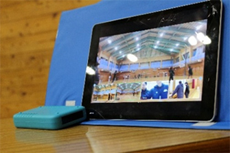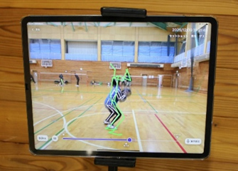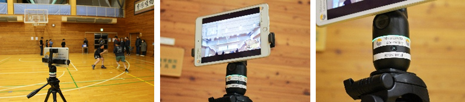 - オンライン指導で欠かせないのが、長野市にいるコーチと生徒たちをつなぐオンラインツールです。この日は、3台のカメラに被写体を自動で認識・追跡する機能を持つAI(人工知能)を搭載した「AI三脚」を取り付けて使用しました。バスケットボールの素早い動きにも反応し、「AI三脚」付きのカメラが生徒の動きを自動で追尾するため、遠隔にいるコーチでも様々な角度からリアルタイムで映像を確認することができます。